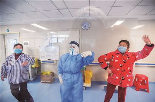 上图:3月3日,湖北省黄冈市大别山区域医疗中心,湖南支援黄冈医疗队队员田亚文带着患者做呼吸操 |