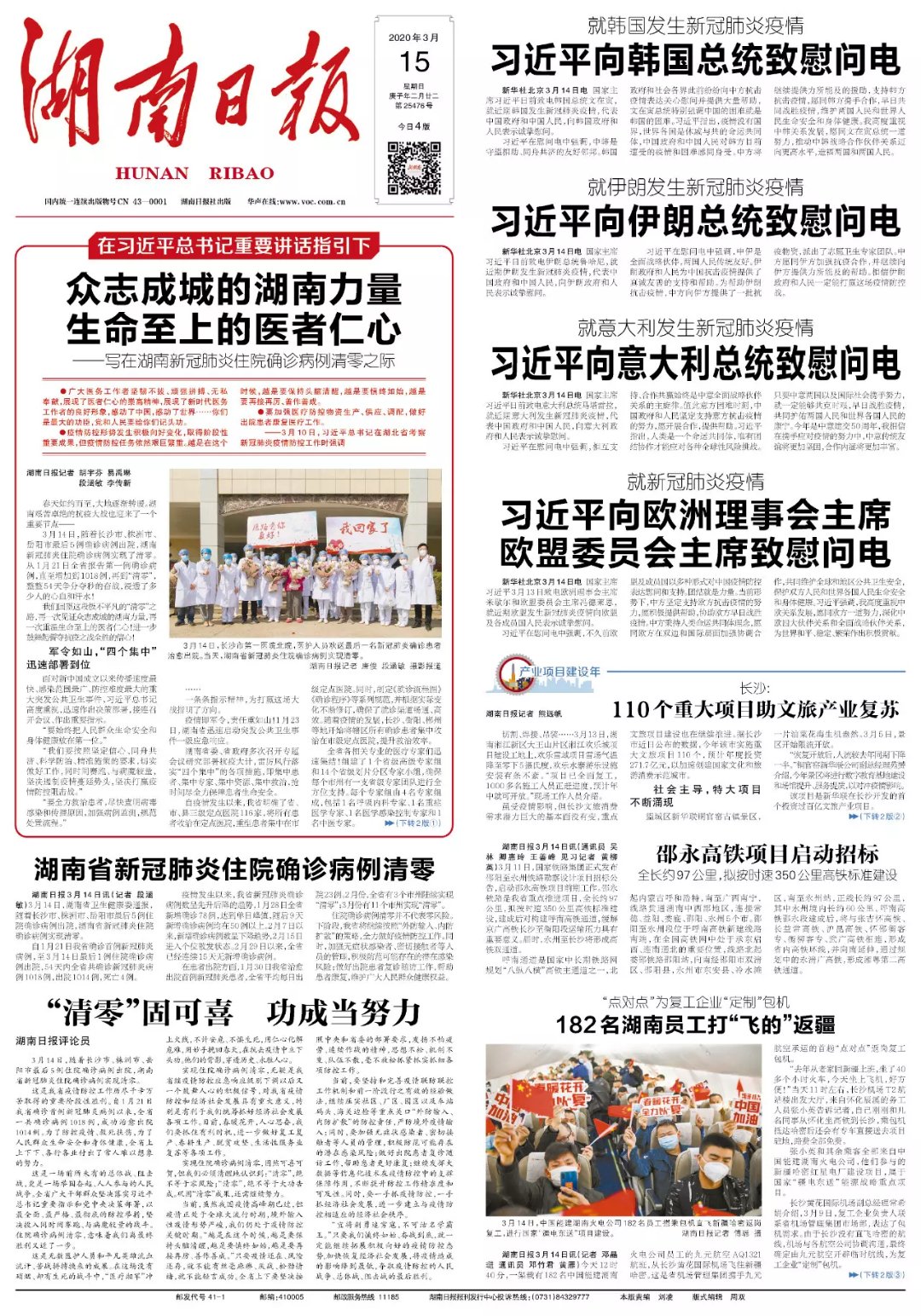 3月14日,随着长沙市、株洲市、岳阳市最后5例确诊病例出院,湖南新冠肺炎住院确诊病例实现了清零。从1月21日全省报告第一例确诊病例,直至增加到1018例,再到“清零”,整整54天争分夺秒的奋战,浸透了多少人的心血和汗水!