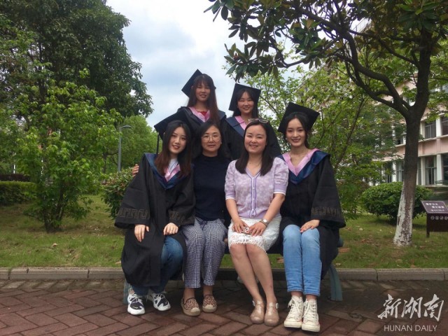 同寝室考研成功的同学们与谢粤湘(左二)、杨易(左三)毕业前合影