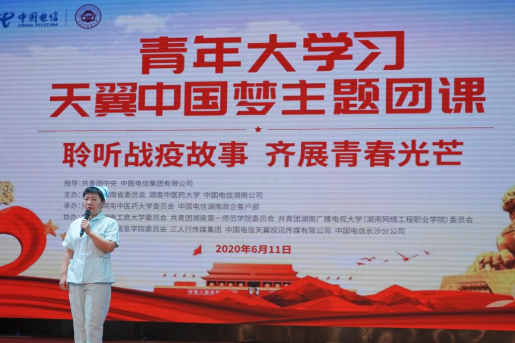 新湖南客户端6月13日讯(通讯员 严璐 徐漱彧 王晓凤)讲述战“疫”故事,凝聚青春力量,6月11晚7点,共青团湖南省委、湖南中医药大学、中国电信共同举办的“青年大学习·天翼中国梦”线上主题团课在湖南中医药大学开讲,来自湖南中医药大学及其附属医院、湖南工商大学、湖南第一师范学院、湖南广播电视大学、湖南信息学院等高校的12万名团员青年共同观看了本次主题团课。