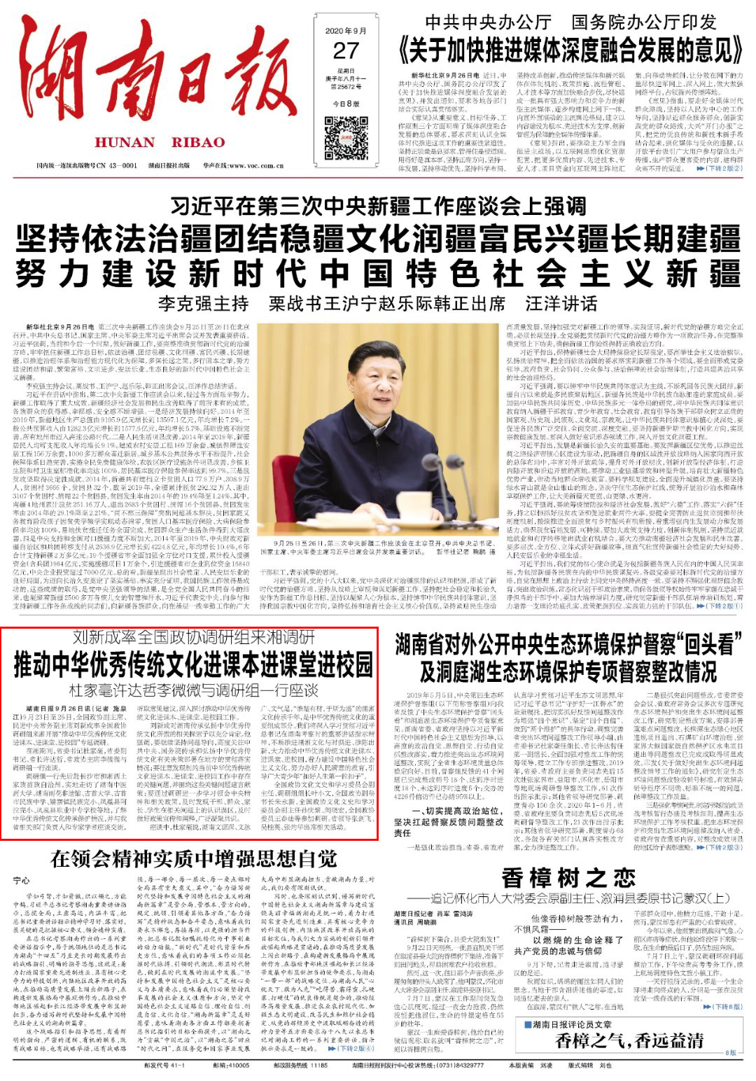 湖南日报9月26日讯(记者 施泉江)9月23日至26日,全国政协副主席、民进中央常务副主席刘新成率全国政协调研组来湘开展“推动中华优秀传统文化进课本、进课堂、进校园”专题调研。