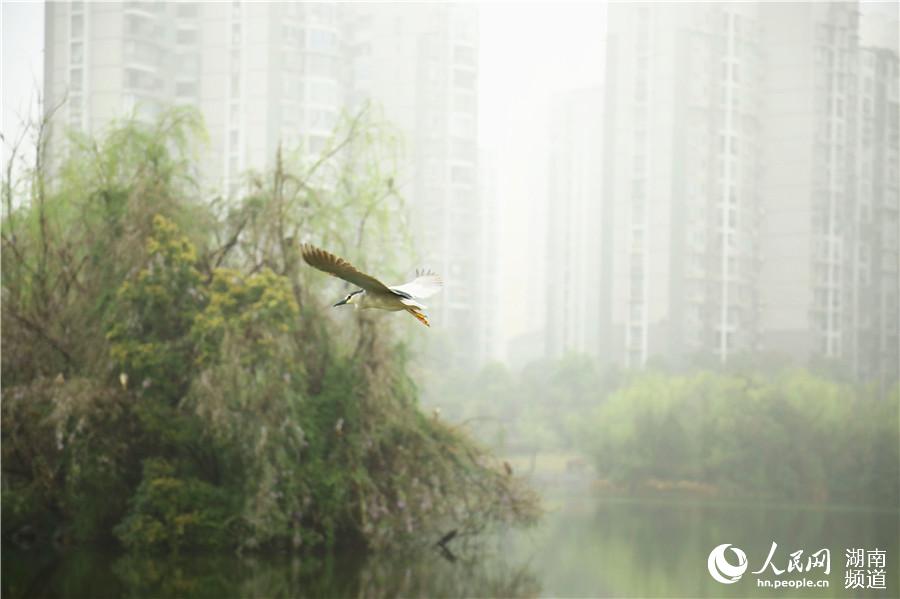人民网长沙4月9日电 (李芳森)暮春时节,湖南长沙的室外气温上升至15℃左右。新月湖面,湖心岛上,白鹭、夜鹭成群结队地返回旧巢,让这两座小岛重获“白鹭洲”之称。