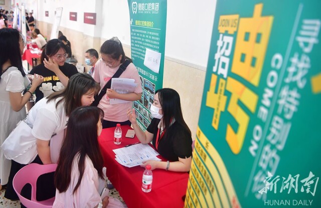 6月5日,应届毕业生在专场招聘会上咨询选择岗位。当天,湖南中医药大学2021届毕业生校友单位专场招聘会在含浦校区举行。此次招聘会共有160余家医疗卫生单位、医药类企业参会,累计提供5000余个岗位,共有近2000名毕业生参会。湖南日报·新湖南客户端首席记者 郭立亮 通讯员 沙凯歌 摄影报道