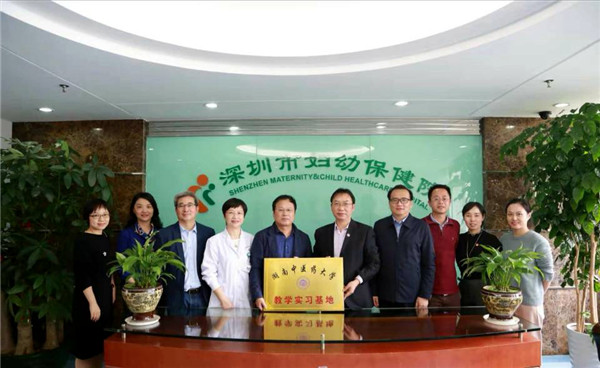 林怿昊致欢迎辞,介绍了医院基本情况。何清湖简要介绍了我校的办学历史、规模、人文与管理学院概况、应用心理学专业建设等方面的情况,代表我校签订了教学实习基地合作协议,向深圳市妇幼保健院授予了“湖南中医药大学教学实习基地”牌匾。何清湖希望双方由原来探索性合作转变为深度合作,发挥中医特色优势,实现共同发展。