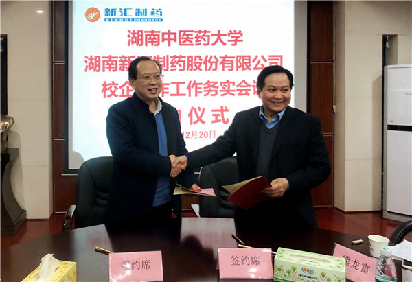 葛金文、何述金分别代表湖南中医药大学、湖南新汇制药股份有限公司签署《毕业生就业基地合作协议书》。