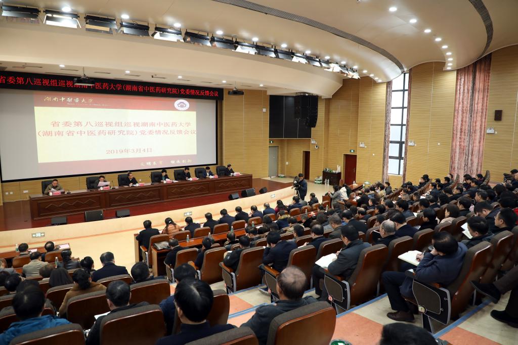根据省委统一安排,2019年3月4日,省委第八巡视组向湖南中医药大学(湖南省中医药研究院)党委反馈巡视情况。省委副书记乌兰出席反馈会议并讲话,省纪委副书记、省监委副主任程纪龙传达了省委书记、省人大常委会主任杜家毫关于巡视工作的重要讲话精神。省委第八巡视组组长张伟达代表巡视组反馈巡视情况。湖南中医药大学党委书记秦裕辉主持反馈会议并作表态讲话。省委副秘书长秦国文,省教育厅党组副书记、副厅长、省委教育工委副书记王瑰曙,省委第八巡视组副组长伍小艾出席会议。