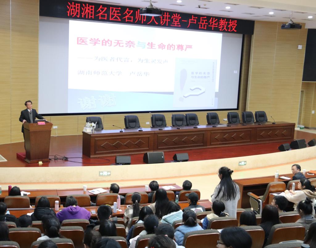 3月13日晚,由教务处、校团委联合举办的2018~2019学年第二学期第一次名医名师大讲堂,在第三教学楼学术报告厅开讲。湖南师范大学原常务副校长、博士生导师卢岳华教授,为大家带来了一场主题为“医学的无奈与生命的尊严——为医者代言 为生灵发声” 精彩学术报告,吸引了500余名学生到场聆听。