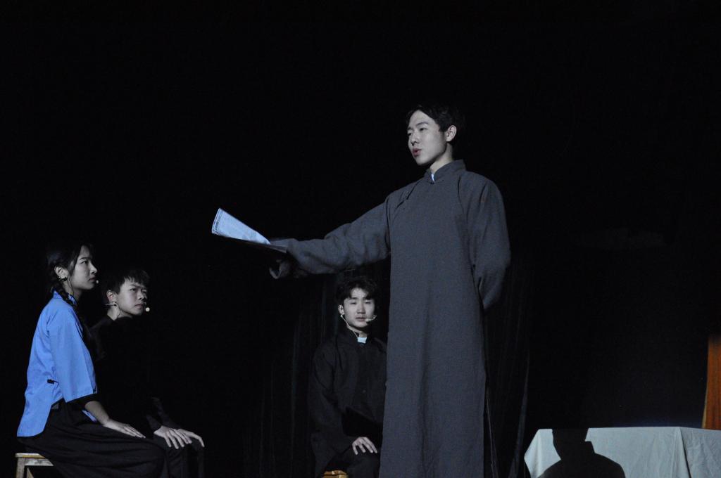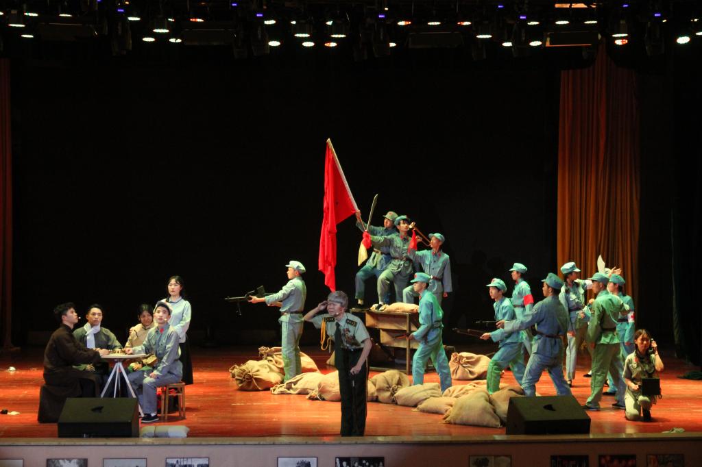 话剧开场的序和最后一幕都采取抗战老军人站在现代时空回顾和感慨过去浴血奋战史的形式,形成了一种前后呼应、时空交错的特殊美感,具有极强的感染力和表现力。剧团成员们在台上尽情发挥,声情并茂地演绎将戏中人物的形象和情感都展现地淋漓尽致,恰如其分地反应当时社会背景下那一代人的记忆和成长。话剧设置正反两派人物的矛盾与冲突,将那个时代风华正茂的青年人的大义凛然、自若从容与慷慨赴死烘托得极其鲜明,引得台下观众的心绪随着剧情起伏跳动,感动于剧中主人公用生命诠释对革命信仰的青年志气。