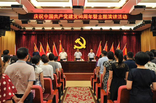7月11日下午,附一院在学术报告厅举行庆祝中国共产党建党98周年暨专题学习大会。副校长易刚强,全体在家院领导,护士长以上中层干部、党支部书记、党员代表、民主党派代表、离退休代表等300余人参加大会。大会分两个阶段进行,第一阶段为庆祝中国共产党建党98周年暨“守初心、担使命,努力开创医院高质量内涵发展”主题演讲活动;第二阶段为副校长易刚强讲党课。大会由医院党委副书记、院长陈新宇主持。