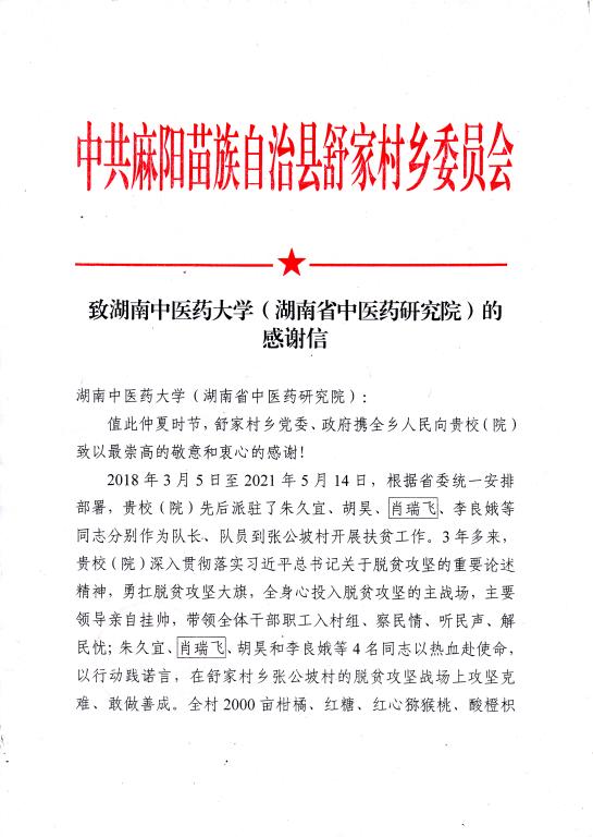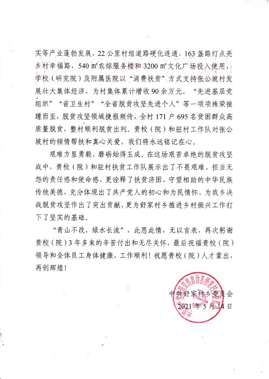 日前,舒家村乡党委、政府向我校发来感谢信,对我校扶贫工作表达了衷心的感谢。