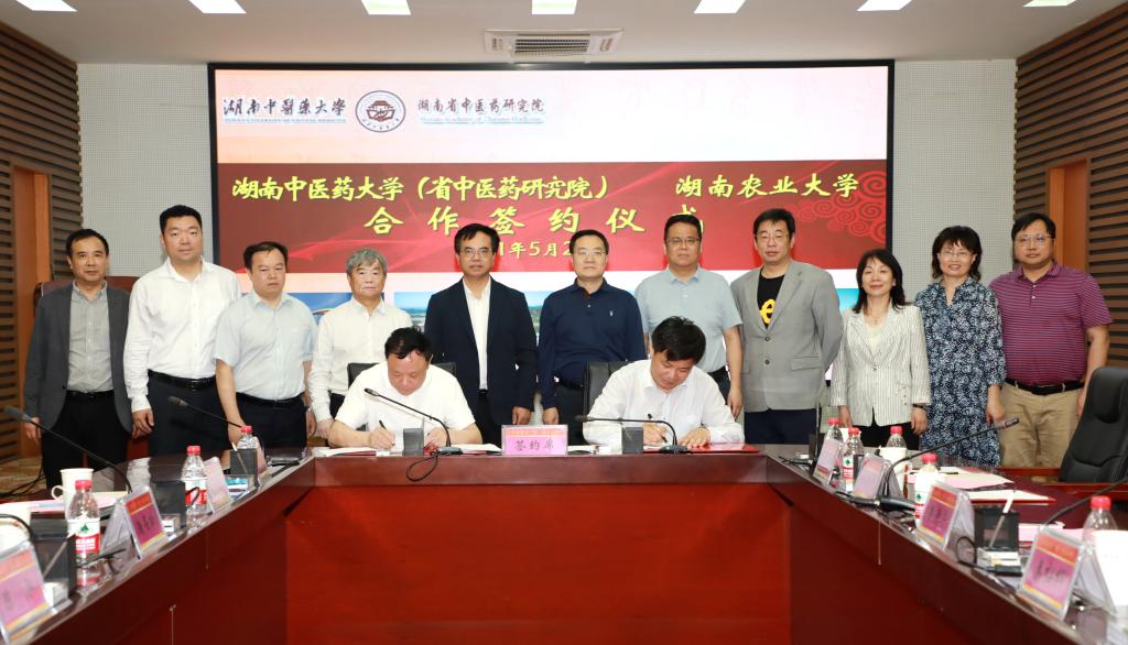 唐圣松、彭清华分别代表湖南农业大学、湖南中医药大学共同签署了《科技战略合作框架协议书》。