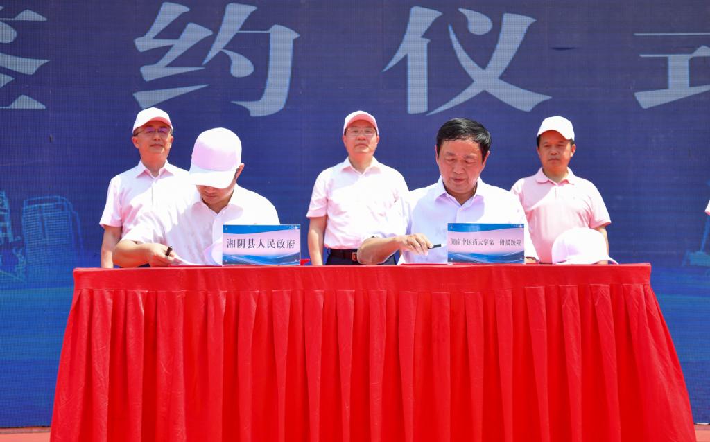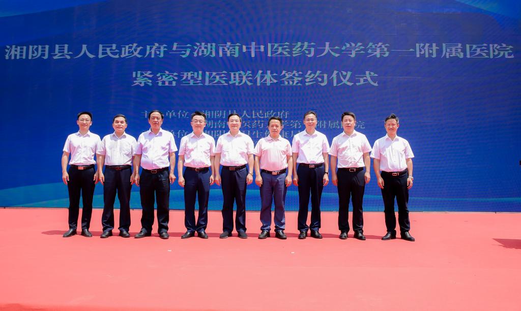 6月8日上午,附一院与湘阴县人民政府紧密型医联体签约仪式在湘阴县中医医院新址举行。校(院)党委书记秦裕辉,副校长刘红华,省中医药管理局副局长肖文明,岳阳市人民政府副市长李为,附一院院长陈新宇等出席仪式。