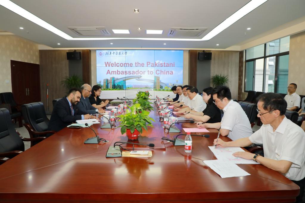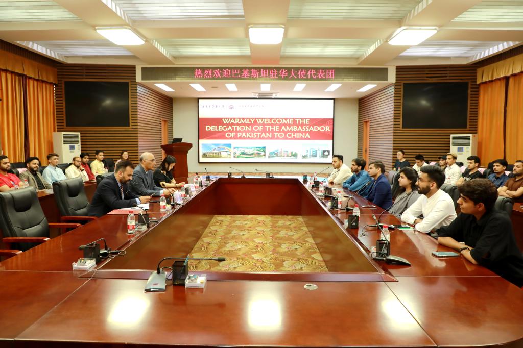 秦裕辉对莫因·哈克大使一行的到来致以热烈欢迎,并介绍了我校办学历史、办学特色及国际交流等情况。秦裕辉表示,今年是中巴建交70周年,经过两国领导人及人民多年的努力,双方建立了比山高、比海深、比蜜甜的情谊。他指出,我们将传承好、发扬好中巴全天候友谊,与巴基斯坦开展更高水平、更广范围、更深层次的合作。