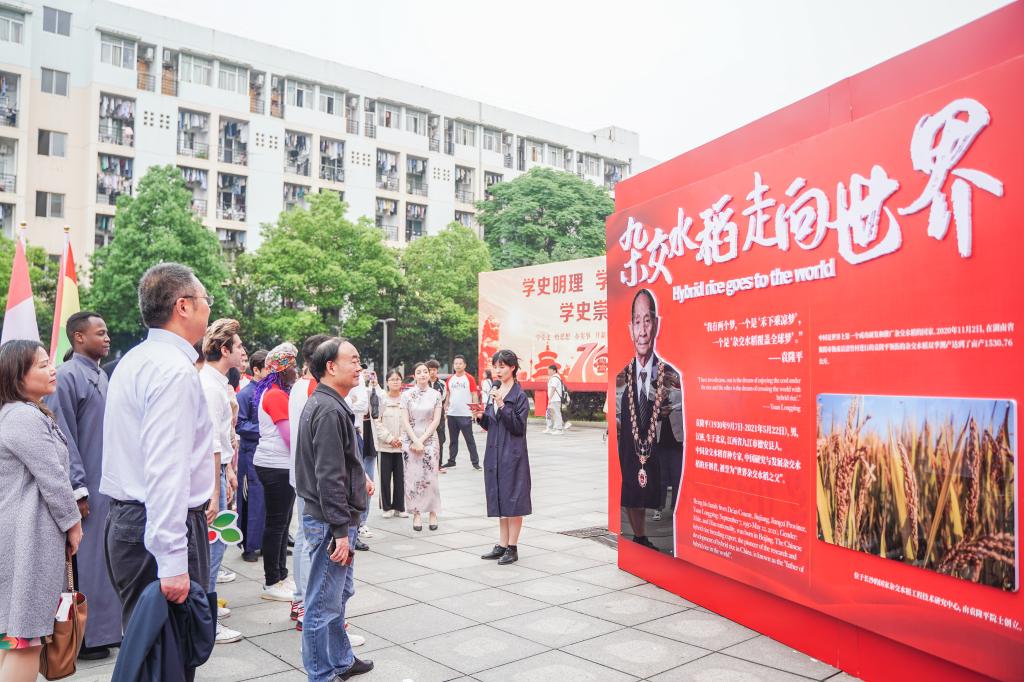 主题公开课后,“世界的东方·眼中的中国”记实图文展开幕。本次展览分为“大国外交风云”、“国际学生在华日记”、“邀你来创作打卡”三个展区,其中“打过外交风云”展区中还对袁隆平“禾下乘凉梦”“杂交水稻覆盖全球梦”及其背后的感人故事和崇高共产主义精神进行了展示。据悉,展览开放后将邀请湖南其他高校的国际学生共同参观,让更多的国际学生在现实场景中了解中国共产党建党百年辉煌历史。
