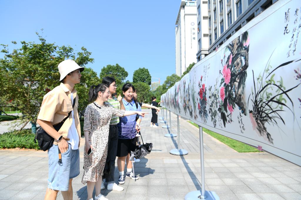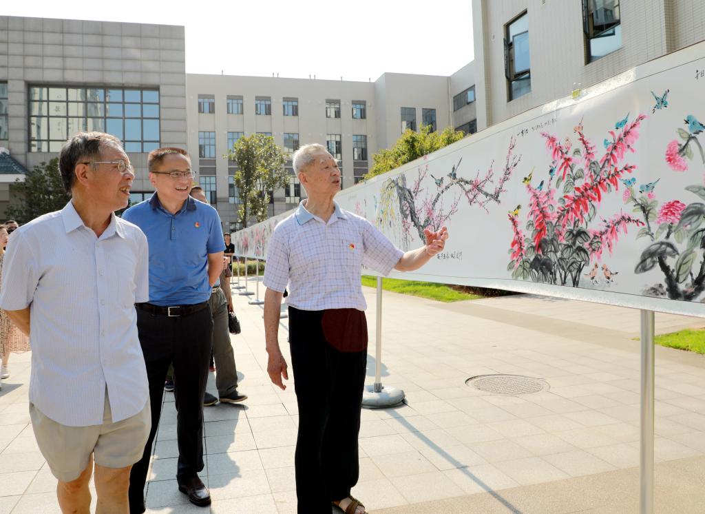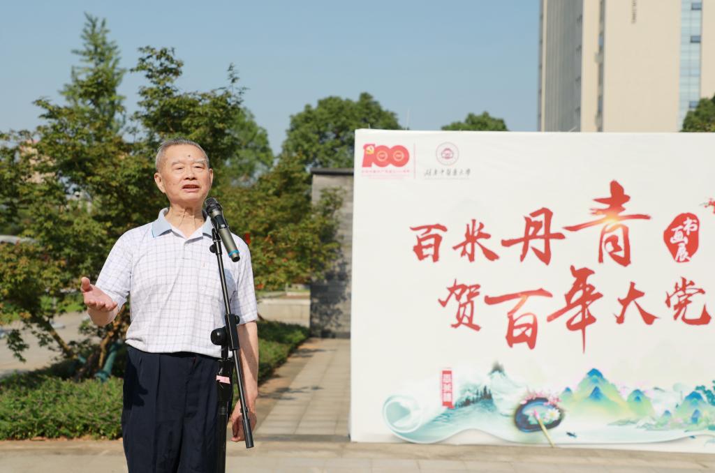 6月23日,由校(院)党史学习教育领导小组主办的“百米丹青贺百年大党”书画展在第三教学楼南侧广场举行。校(院)党委副书记易刚强,校(院)党委委员焦珞珈,书画作者、我校退休干部王弗环及其家属,党政办、宣传统战部、离退休处、机关党委、学生工作部、保卫处相关职能部门负责人,离退休职工及学生代表等参加活动。开幕式由焦珞珈主持。