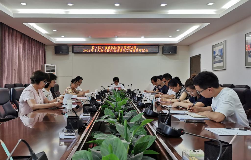 6月29日,校(院)廉政风险重点事项监督、2021年十大重点任务推进情况专项督查布置会在行政楼二楼会议室召开。会议由校(院)纪委书记张玉芬主持,督查组全体成员参会。
